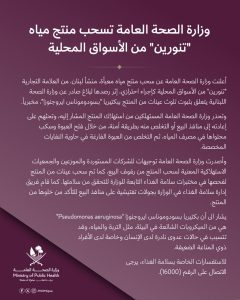 أقدمت وزارة الصحة العامة في قطر بسحب مياه “تنورين” من الأسواق المحلية، وناشدت المستهلكين التوقف عن استخدام هذا المنتج، مع دعوتهم لإرجاعه إلى نقاط البيع أو التخلص منه بشكل آمن عبر فتح العبوة وسكب محتواها في مجرى المياه.