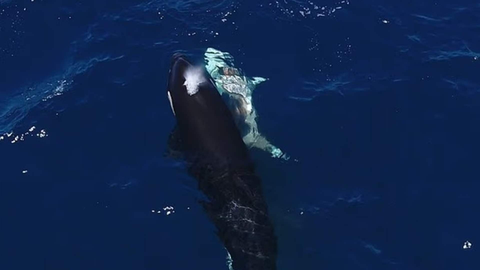 ويُظهر الفيديو مجموعة مكوّنة من خمسة حيتان قاتلة متخصصة في صيد القروش، وهي تطارد سمكة قرش بيضاء شابة أصغر حجماً، قبل أن تنقلب على ظهرها لتُشلّ حركتها تماماً.