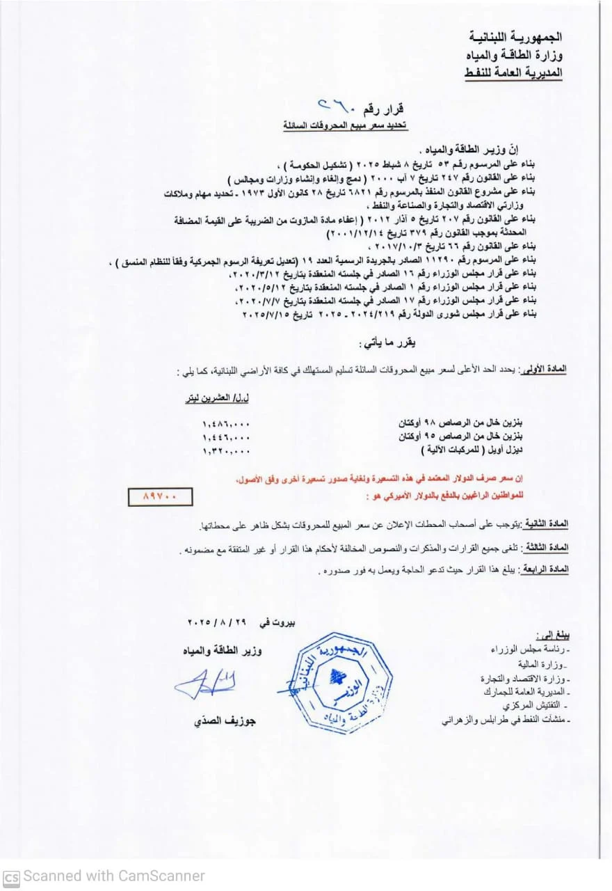 صدر عن وزارة الطاقة والمياه صباح اليوم الجمعة، جدولٌ جديد للمحروقات، وجاءت الأسعار على الشّكل التالي: