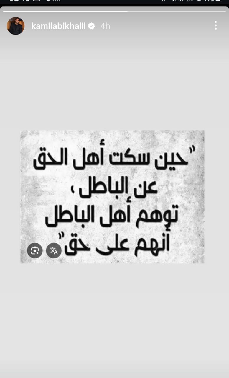 ونشر أبي خليل صورة تحمل عبارة: “حين سكت أهل الحق عن الباطل توهّم أهل الباطل أنهم على حق”, في خطوة فسّرها المتابعون كرسالة مباشرة على حديث ماريتا عن تجربة الطلاق التي مرّت بها في سن مبكرة.