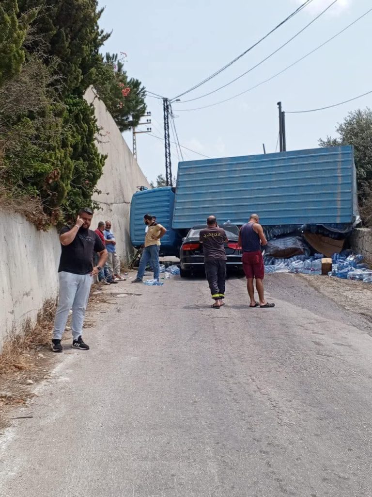 وقع حادث سير مروّع على طريق رأس نحاش البترونية، إثر انزلاق شاحنة تابعة لإحدى شركات بيع المياه وانقلابها ما أدى إلى سقوطها فوق سيارة كانت تمر في المكان.