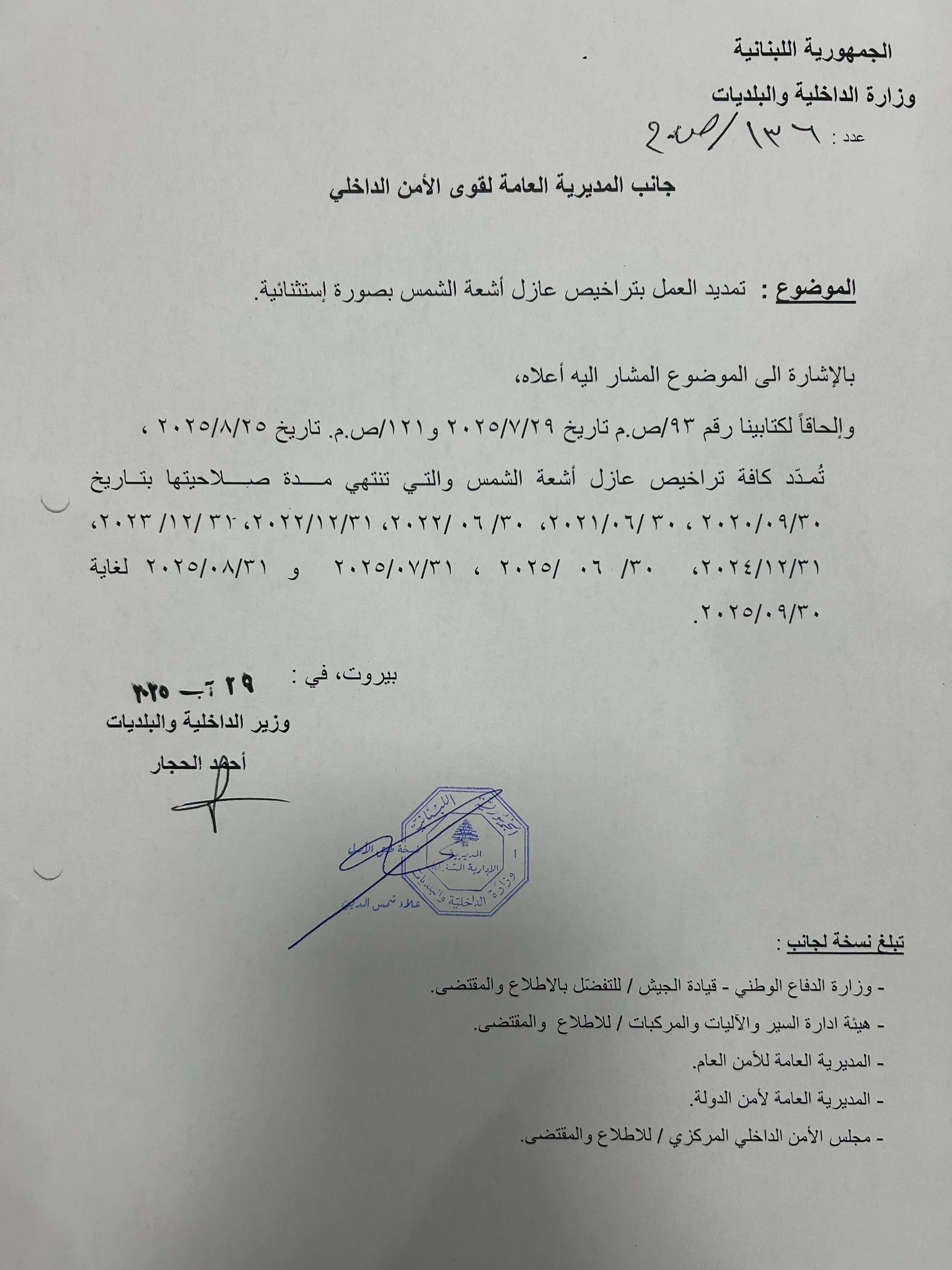 أعلنت وزارة الداخلية والبلديات عن تمديد العمل بتراخيص تركيب عازل أشعة الشمس (الفوميه) على زجاج السيارات، بصورة استثنائية، حتى 30 أيلول 2025، وذلك في إطار التسهيلات الممنوحة للمواطنين، وتنظيم الإجراءات المرتبطة بالموافقات الأمنية.